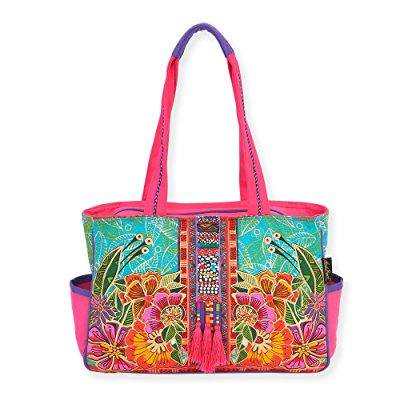 This square Laurel Burch canvas purse measures approximately 18" x 5" x 15". It has a top zipper closure, double 28" straps, an inside zipper pocket (7 1/2" x 8"), 2 inside small open pouch ... View Video